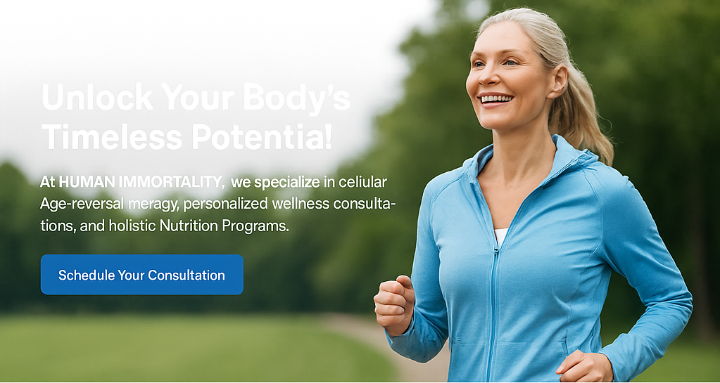 At HUMAN IMMORTALITY, we specialize in cellular age-reversal therapy, personalized wellness consultations, and holistic nutrition programs designed to optimize energy, vitality, and longevity.